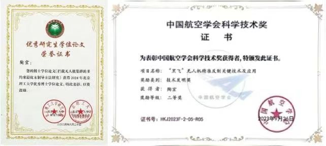 在国防迫切需求驱动下,我的博士课题围绕拦截无人机集群的多约束最优末制导方法开展研究,在控制领域顶级期刊上发表SCI期刊论文7篇,国际会议论文3篇,申请发明专利5项,获航空学会科学技术发明二等奖。然而,我深知理论知识从书架到货架仍面临着很大挑战,如何将“理论高效”技术落实到复杂真实环境中的“应用可靠”,国防装备应用中实现科技转化服务祖国,是我未来努力的重点方向。