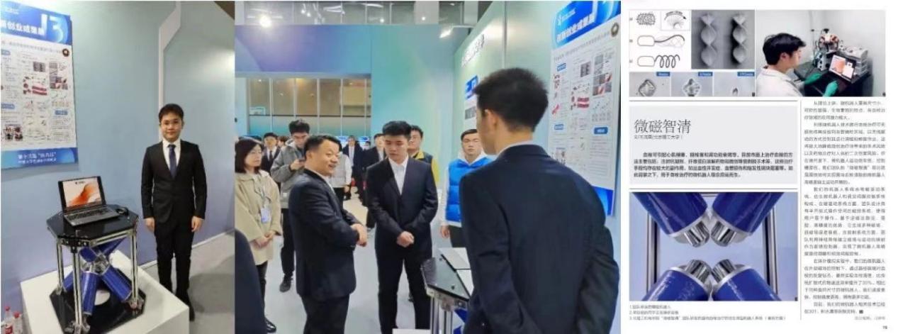 另一方面,我也发现单纯的科研是不够的,科研必需要能够落脚于实际的应用中,方才有真正的意义。我和团队将现有成果结合当今医疗实际需求,不断打磨项目,制定方案,探索微纳机器人如何应用在真实医疗场景中。2022年夏天,我和团队在经历初赛选拔后,晋级了在杭州举办的中国医疗器械创新创业大赛人工智能与医用机器人决赛。中国医疗器械创新创业大赛是由科技部社会发展科技司发起和指导的比赛,作为“科创中国”系列活动之一,已成为国内专业度高、参与度广、配套完备,是国内医疗器械领域最权威的赛事。作为现场唯一一支本科生队伍,我们在与多家国内顶级医院、企业的比拼中脱颖而出,获得了决赛第20名的好成绩。在与现场专家交流的过程中,我进一步了解到微纳机器人之于医疗、之于国家的重大意义。