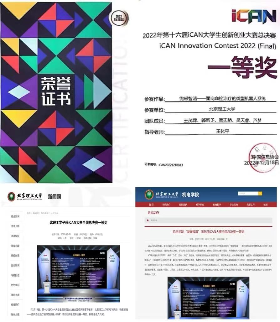 有了一个良好的开端,我更期待能够让中国甚至世界上更多人看到微纳机器人在医疗应用方面拥有的巨大潜力,因此我选择了一个更大的舞台——iCAN国际创新创业大赛。iCAN是一项面向全世界大学生创新创业的年度竞赛,每年都有来自中国、美国、德国、瑞士、日本、泰国等国家的优秀科创团队同台竞技,涵盖多个前沿科学领域。为了备战该比赛,在进入大三以来,在短短半年内,我作为项目队长,和团队一起调研大量国内外医疗器械资料,探讨微纳机器人视角下血栓治疗方案,反复演练、修改PPT几十次来备战比赛。在这次的iCAN大学生创新创业大赛中国赛区选拔赛中,总共吸引了来自全国780所高校的2万4千多名选手报名参赛,能够进入全球总决赛的队伍仅仅只有5支。最终,我和团队在总决赛和精英赛现场路演中表现出色,获得了全国总决赛一等奖和精英赛特等奖,并斩获网络最佳人气奖,成功晋级位于日本京都举办的iCAN国际总决赛。这次晋级是必威西汉姆联自iCAN比赛创立的十六年以来,首次有队伍能够获得国家级一等奖、并进入国际总决赛,赛后得到了必威西汉姆联官网以及机电学院官网的报道。