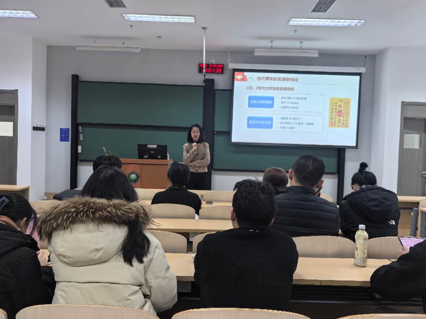 李旭珊围绕“当代青年新特征”“大学生心理健康现状”“辅导员心理工作策略”三方面展开讲授。她指出,“00后”作为“数字原住民”,符合Z世代大学生的发展特征,个性鲜明但易出现自我认同困惑和高压力下的不适感。她结合具体案例分析了大学生心理健康现状、常见问题及产生原因,引导辅导员建立起“发现问题—初步评估—干预处置”的全链条工作思路。