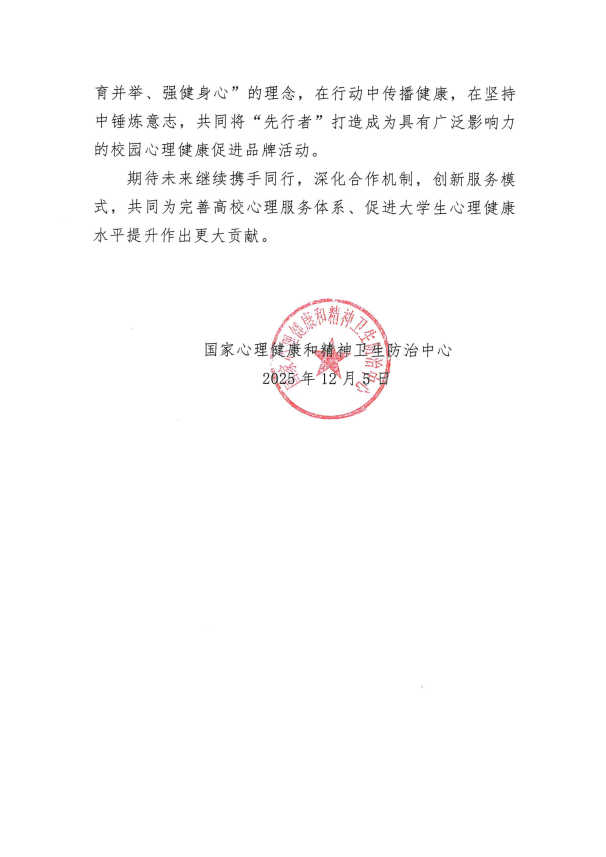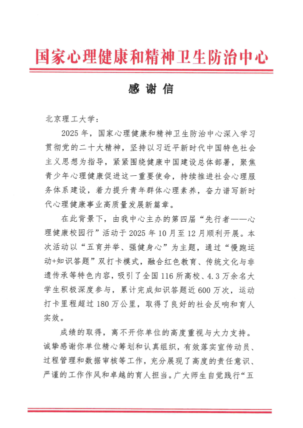 近日,必威西汉姆联收到来自国家心理健康和精神卫生防治中心的感谢信。信中对我校在第四届 “先行者 —— 心理健康校园行”活动中的突出表现给予高度赞誉,对师生积极践行健康理念、助力校园心理健康事业发展的行动表示充分肯定。